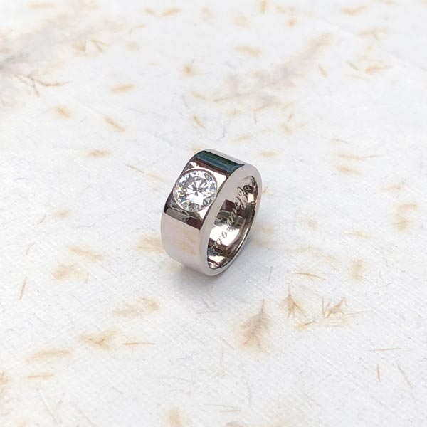 Après quelques échanges, nous avons opté pour une monture assez contemporaine. Une bague « chevalière » où le diamant serait serti masse, c’est-à-dire descendu dans le métal.