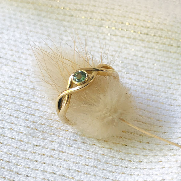 MARINA est une pièce unique en taille 52. Une magnifique tourmaline verte taille brillant y est serti clos. Le jeu de croisements de l’or jaune lui apporte beaucoup de charme. Cette superbe bague en or jaune 18 carats Fairmined est d’une incroyable délicatesse, elle épouse parfaitement le doigt et sera parfaite pour être portée tous les jours.