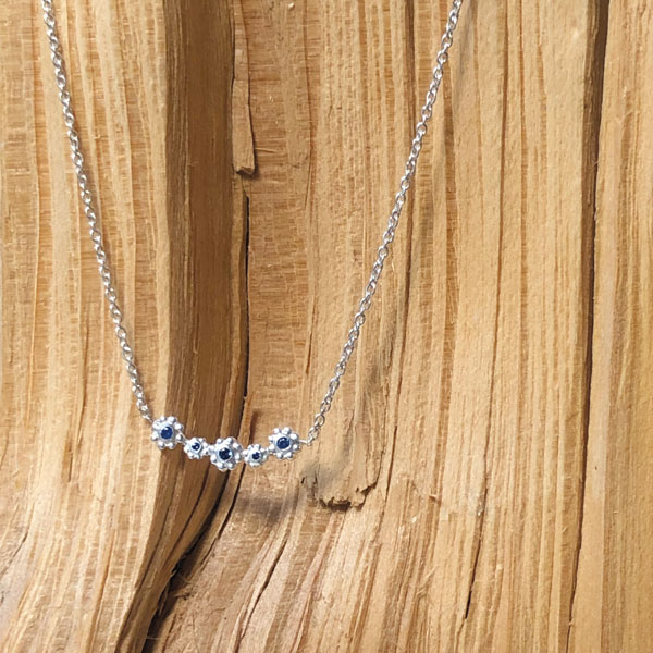 Le collier LENA est fabriqué en argent 925 avec la technique de la granulation. Les grains de métal soudés les uns aux autres forment ces cinq jolies fleurs. Les saphirs bleus sont sertis masse pour un effet WAOUH garanti. A l’atelier on est fan et on ne le quitte plus !